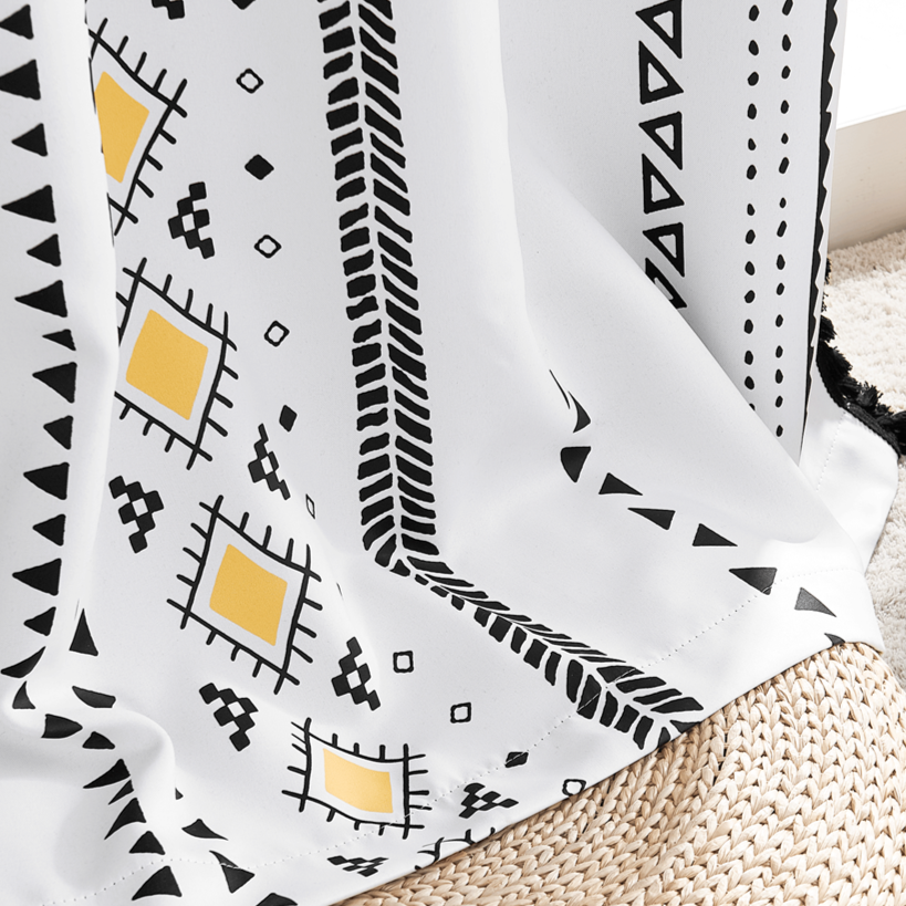 Ta wyjątkowa etniczna zasłona boho z frędzlami to prawdziwa gratka dla estety. Jej białe tło stanowi idealne płótno dla wyrazistych, czarnych geometrycznych wzorów i pionowych pasów, które nadają jej dynamicznego charakteru. Centralny pas z żółtymi rombami dodaje nuty słońca i optymizmu, doskonale komponując się z naturalnymi materiałami i roślinnością. Dzięki uniwersalnej kolorystyce – dominującej czerni i bieli z akcentem ciepłego żółtego – zasłona idealnie wpasuje się zarówno w minimalistyczne, nowoczesne wnętrza, jak i te urządzone w stylu skandynawskim, rustykalnym czy oczywiście typowo boho. Frędzle, biegnące wzdłuż bocznych krawędzi, to nie tylko ozdoba, ale też element, który subtelnie porusza się przy każdym podmuchu wiatru, wprowadzając do pomieszczenia poczucie lekkości i naturalności. System mocowania na przelotkach sprawia, że zawieszenie i przesuwanie zasłon jest niezwykle proste i płynne.