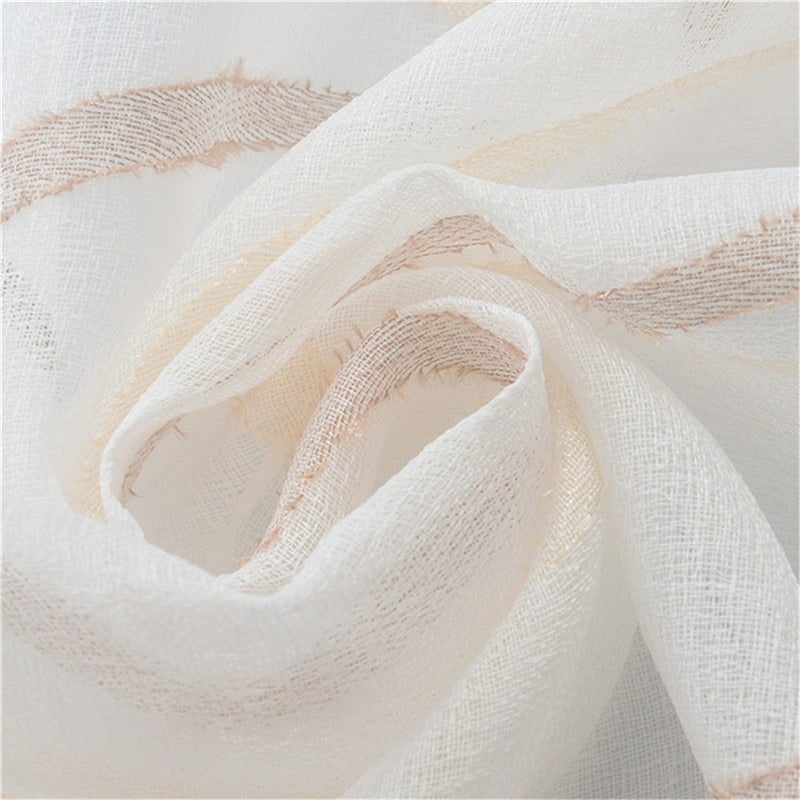To, co wyróżnia naszą nowoczesną firanę, to jej hipnotyzujący wzór pionowych fal. Delikatne, beżowe linie biegnące przez całą długość tkaniny tworzą dynamiczny, a jednocześnie harmonijny efekt. Fale te nie tylko dodają firanie lekkości i głębi, ale również optycznie wydłużają okno, nadając wnętrzu przestronności. Ten subtelny, ale wyrazisty detal sprawia, że firana staje się prawdziwą ozdobą, przyciągającą wzrok i podkreślającą indywidualny styl Twojego domu. Ciesz się grą światła, które przenika przez ten unikalny wzór, tworząc magiczne cienie i refleksy w Twoim pokoju.