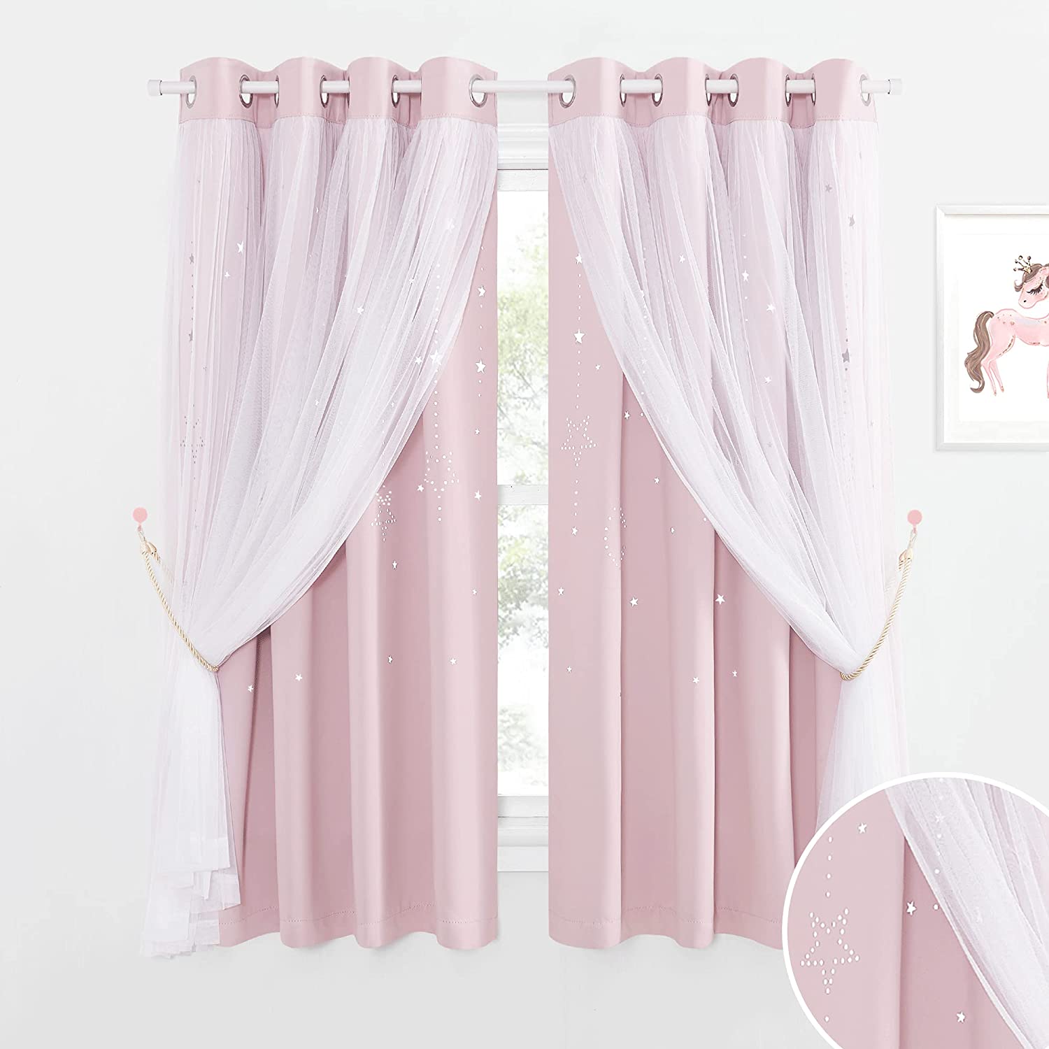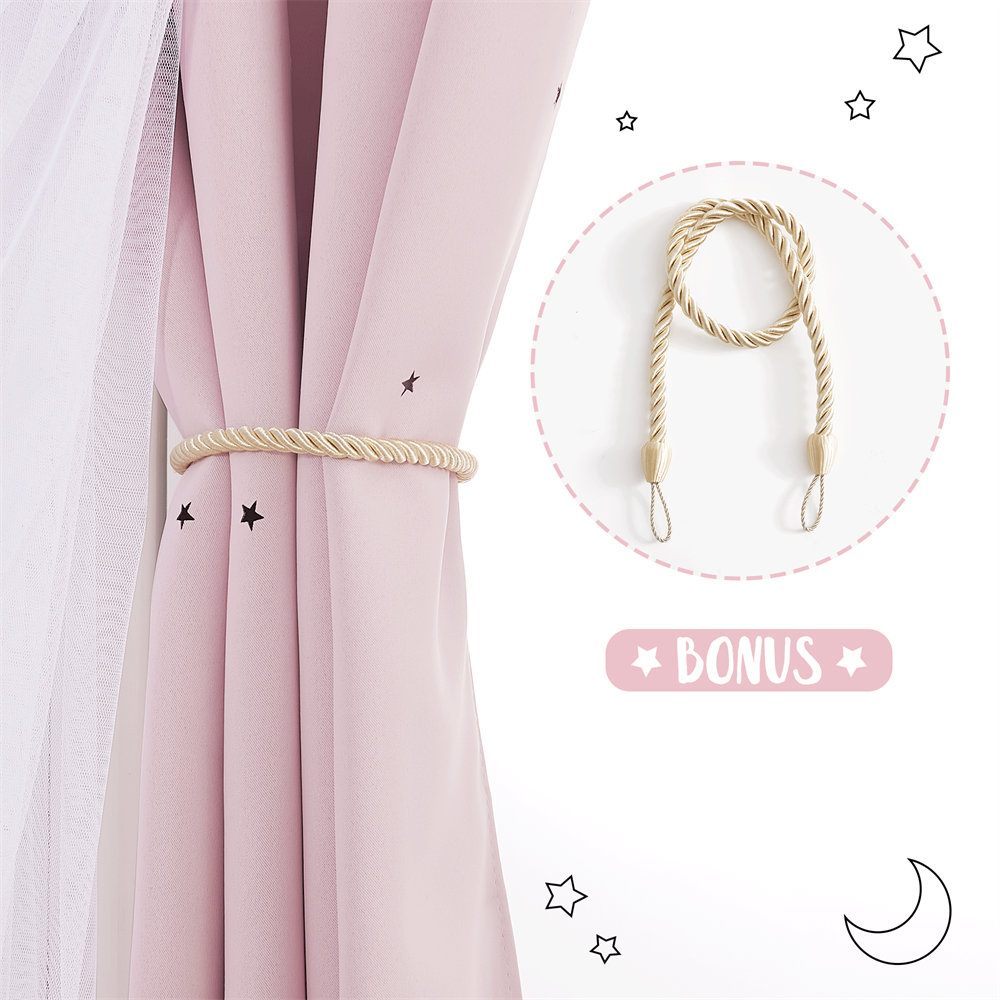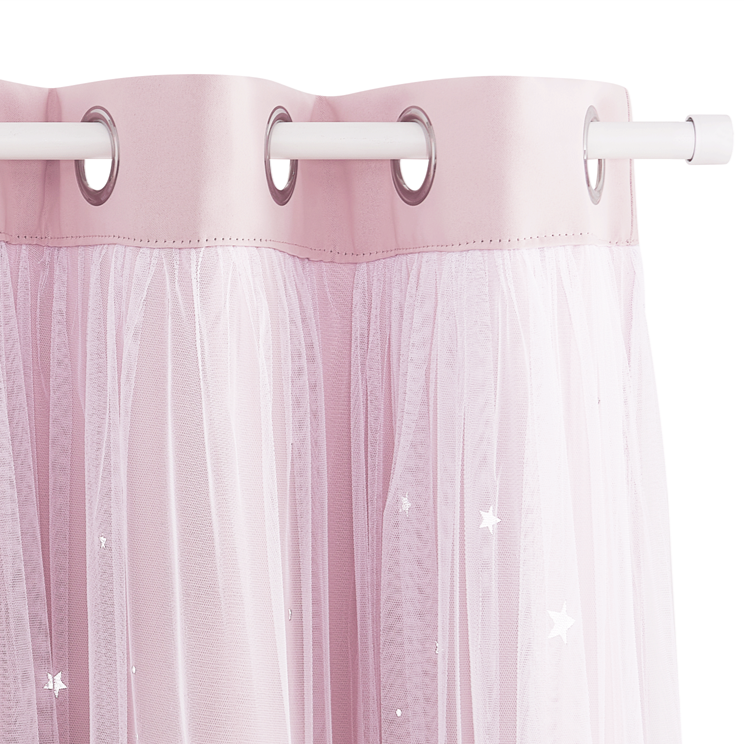- Dwuwarstwowa Konstrukcja: Główna zasłona zaciemniająca w różowym kolorze z wytłaczanymi gwiazdkami oraz lekki biały woal z brokatowymi gwiazdkami, zapewniający elastyczne zarządzanie światłem i prywatnością.