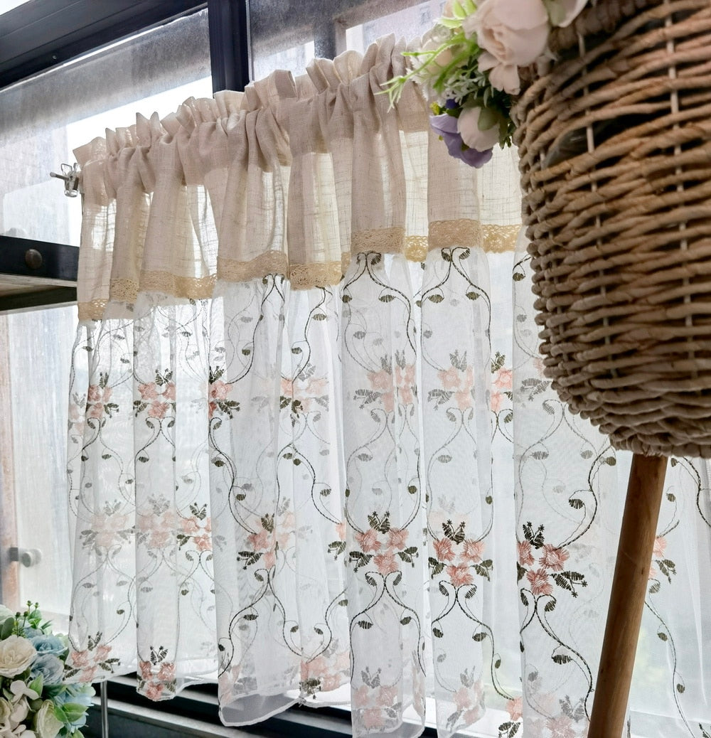 Wyobraź sobie swoją kuchnię skąpaną w miękkim, rozproszonym świetle, a jednocześnie otuloną delikatną prywatnością. Nasza wiejska zazdrostka kuchenna z koronką to coś więcej niż zwykła firanka; to element dekoracyjny, który wniesie ciepło i nutkę idyllicznego, wiejskiego uroku do Twojego domu. Wykonana z lekkiej, zwiewnej tkaniny, ozdobiona jest subtelnym haftem w romantyczne różowe kwiaty i zielone listki, perfekcyjnie uzupełnionym elegancką, rustykalną koronką. Ta zazdrostka przemieni Twoją kuchnię w przytulne, zachęcające miejsce, gdzie każda chwila będzie wyjątkowa, niczym beztroskie dni spędzone na wsi.